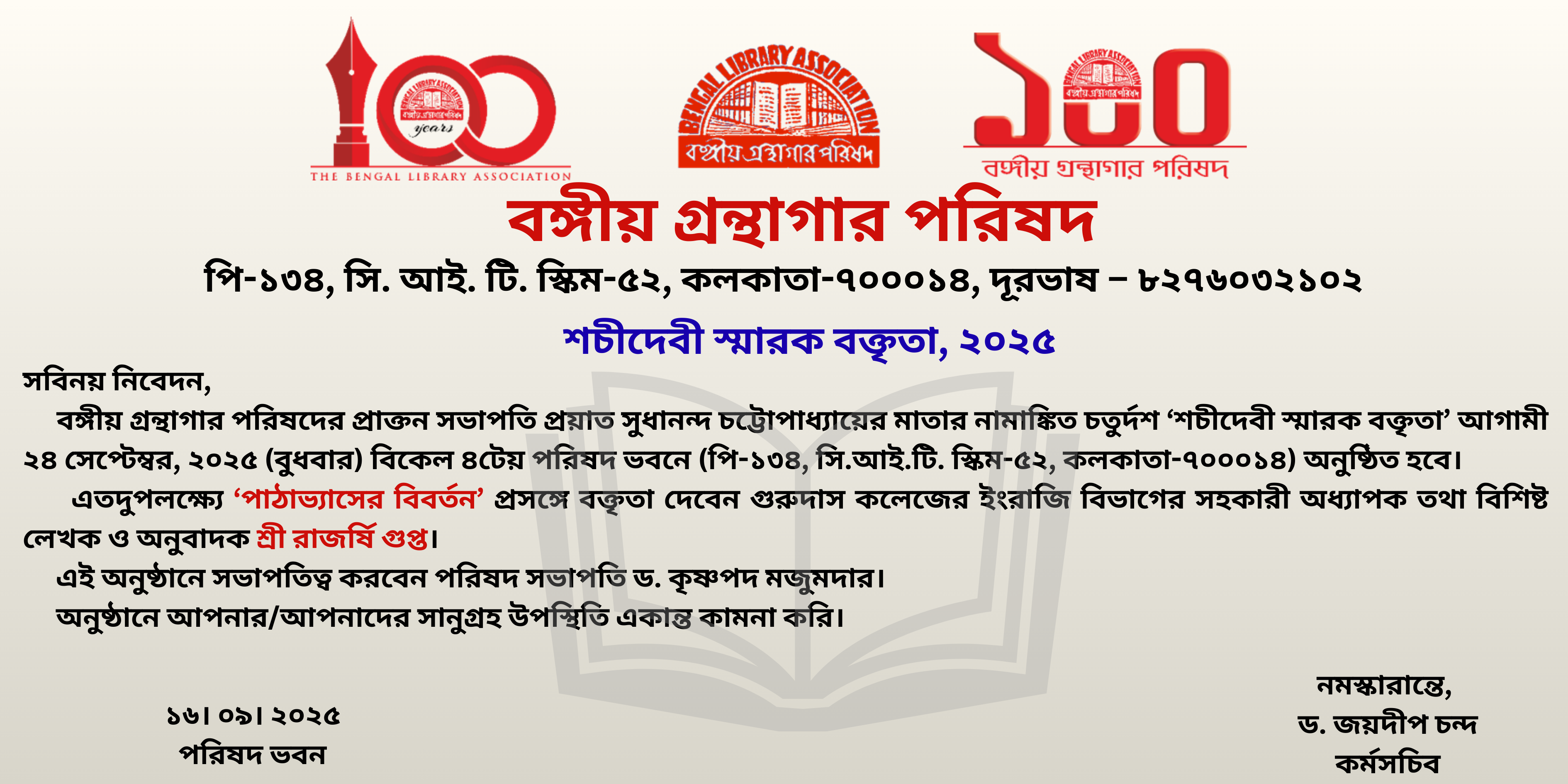 Sachidebi Memorial Lecture, 2025 will be held on 24 September, 2025 at 4.00 PM in BLA Building at Padmapukur (P-134, C.I.T. Scheme-52, Kolkata-700014). All are cordially invited to attend the programme.