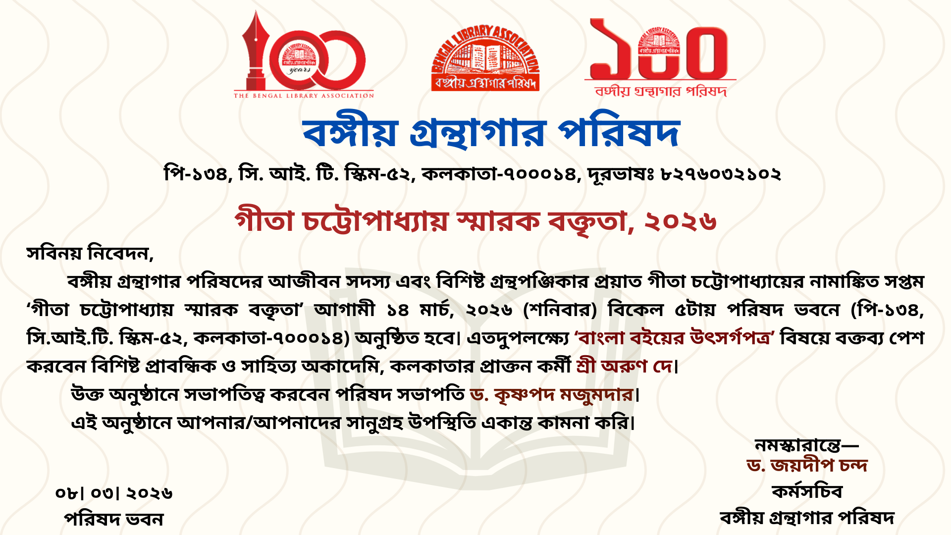 Seventh Gita Chattopadhyay Memorial Lecture will be held on 14 March, 2026 at 5.00 PM in BLA Building at Padmapukur (P-134, C.I.T. Scheme-52, Kolkata-700014). All are cordially invited to attend the programme.