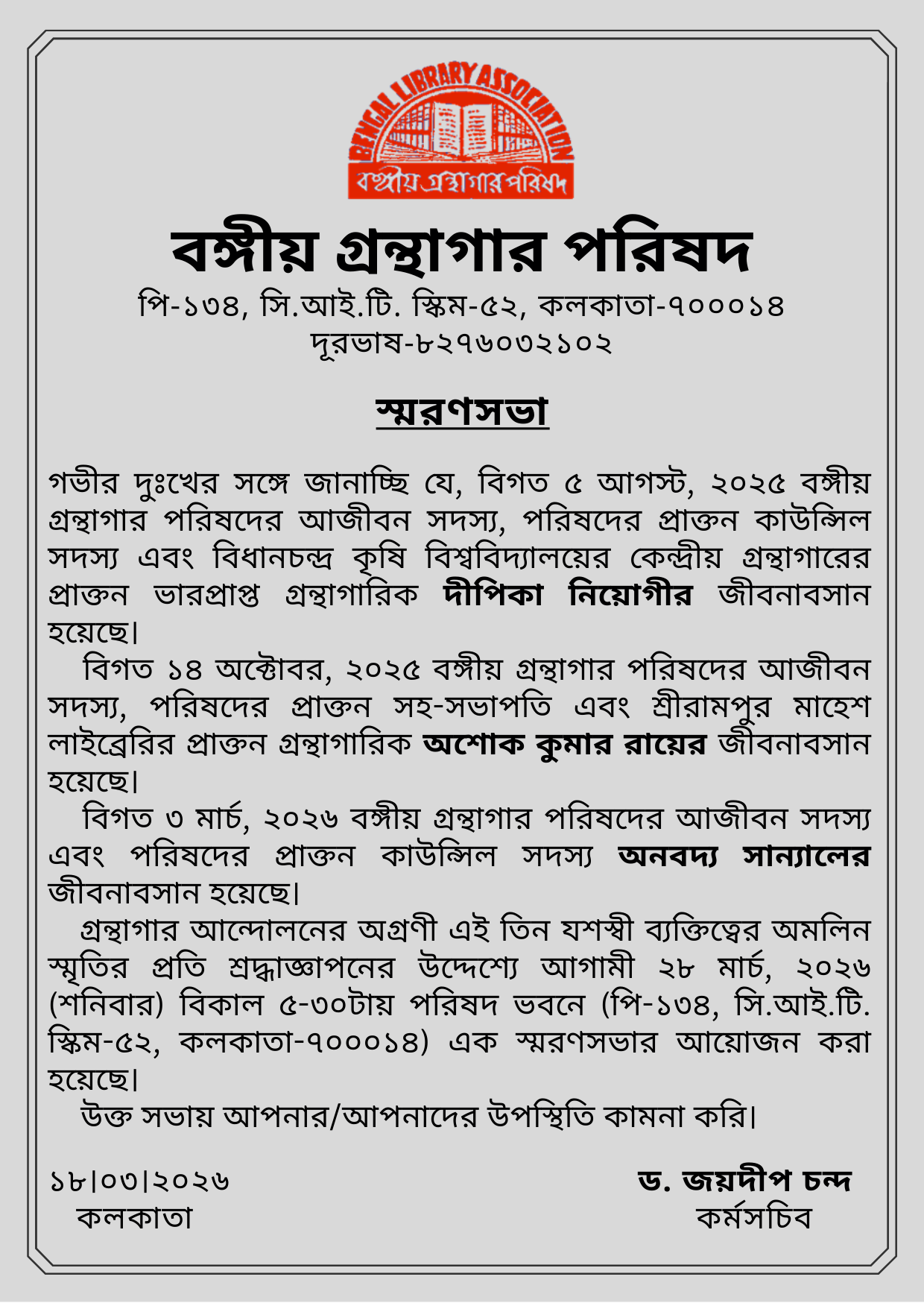 Second Bijaya Banerjee Memorial Lecture will be held on 7 February, 2026 at 5.00 PM in BLA Building at Padmapukur (P-134, C.I.T. Scheme-52, Kolkata-700014). All are cordially invited to attend the programme.